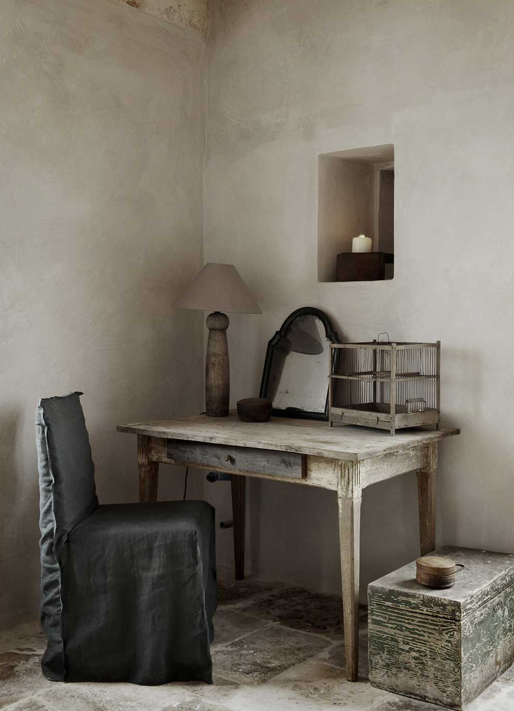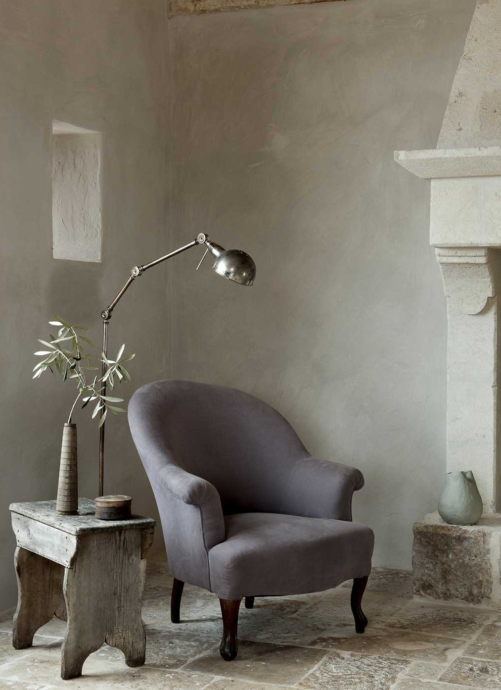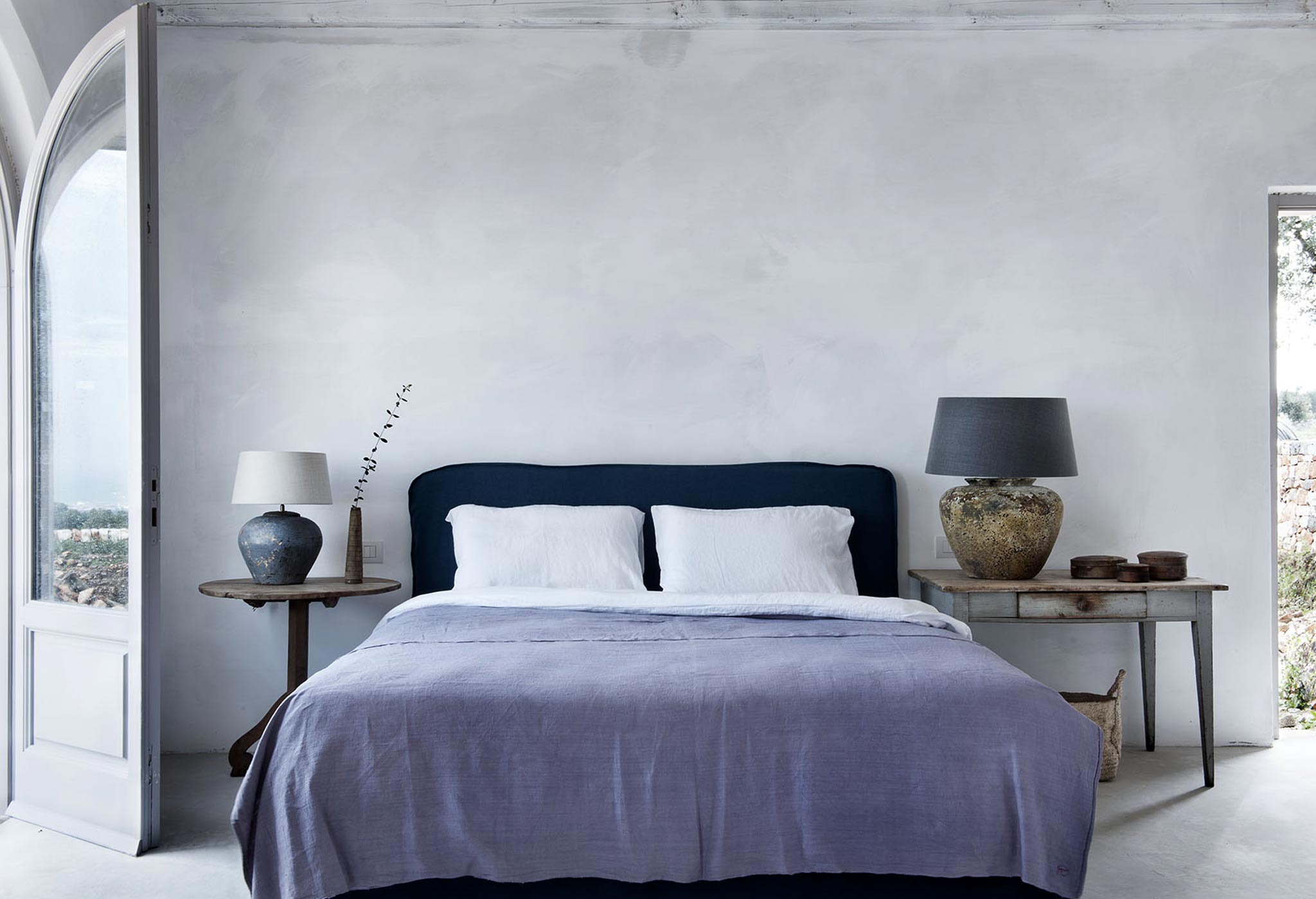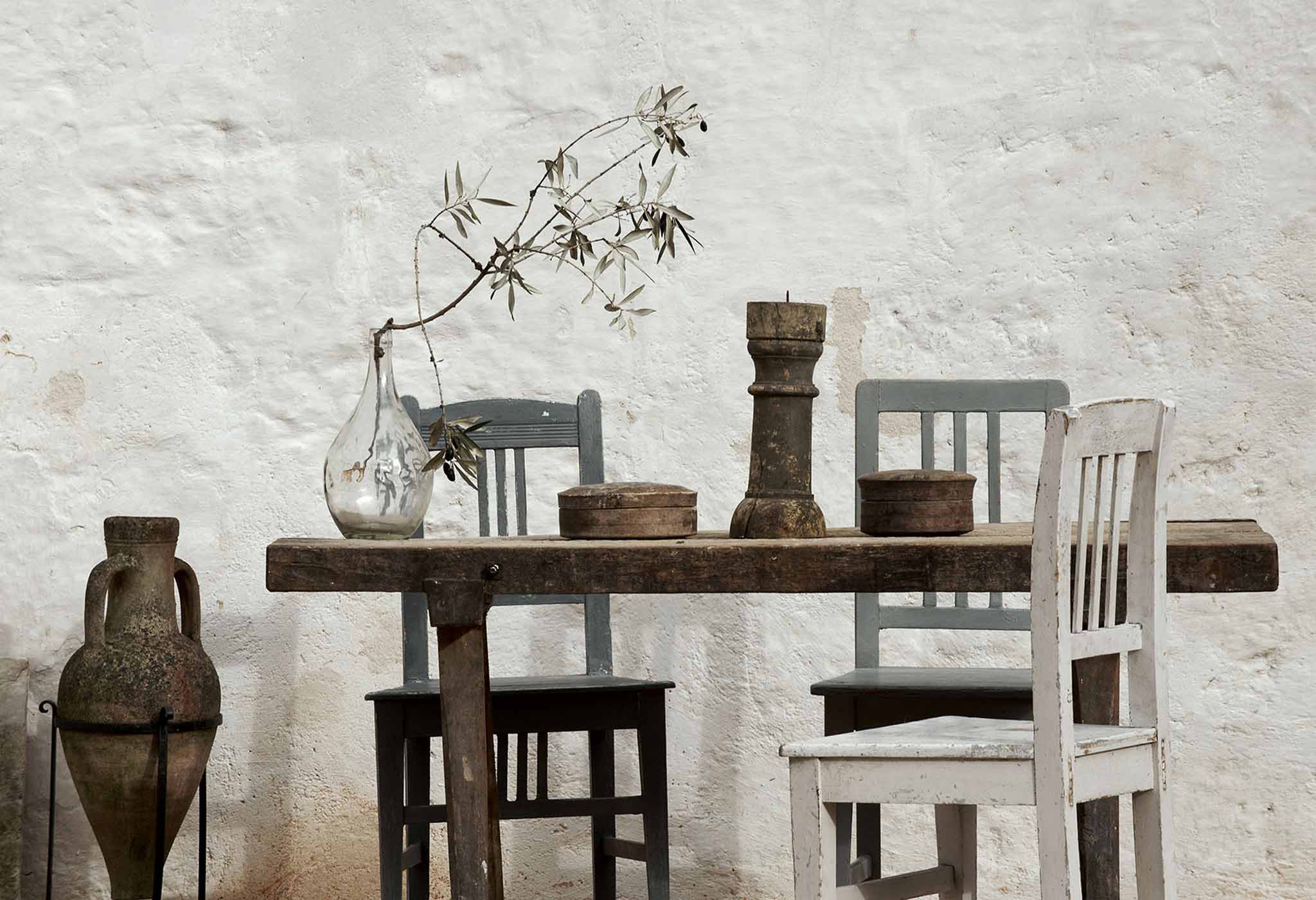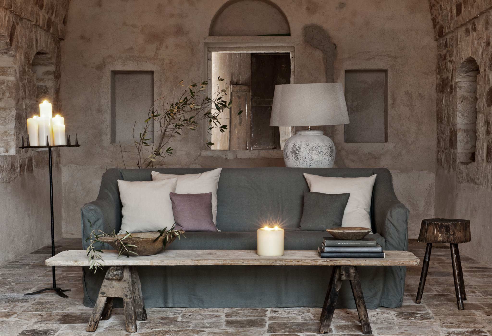 La decoración, piezas adquiridas en Italia combinadas con otras procedentes de otras regiones Europeas, resulta –simplemente- perfecta. Los tonos grises y azules en contraste con la textura de la madera, los suelos fríos y cálidos a la vez, y los ramos de olivos como única decoración en algunos de los ambientes, hacen de ella una casa llena de encanto. Investigando, investigando… he llegado a saber que se alquila. Los detalles, eso sí, se me escapan! De hecho… creo que prefiero seguir soñando con pasar unos días entre sus paredes... Por ahora, me conformo con tomar ideas sencillas para aplicar en casa. ¡Quién tuviera esos techos abovedados...! :)